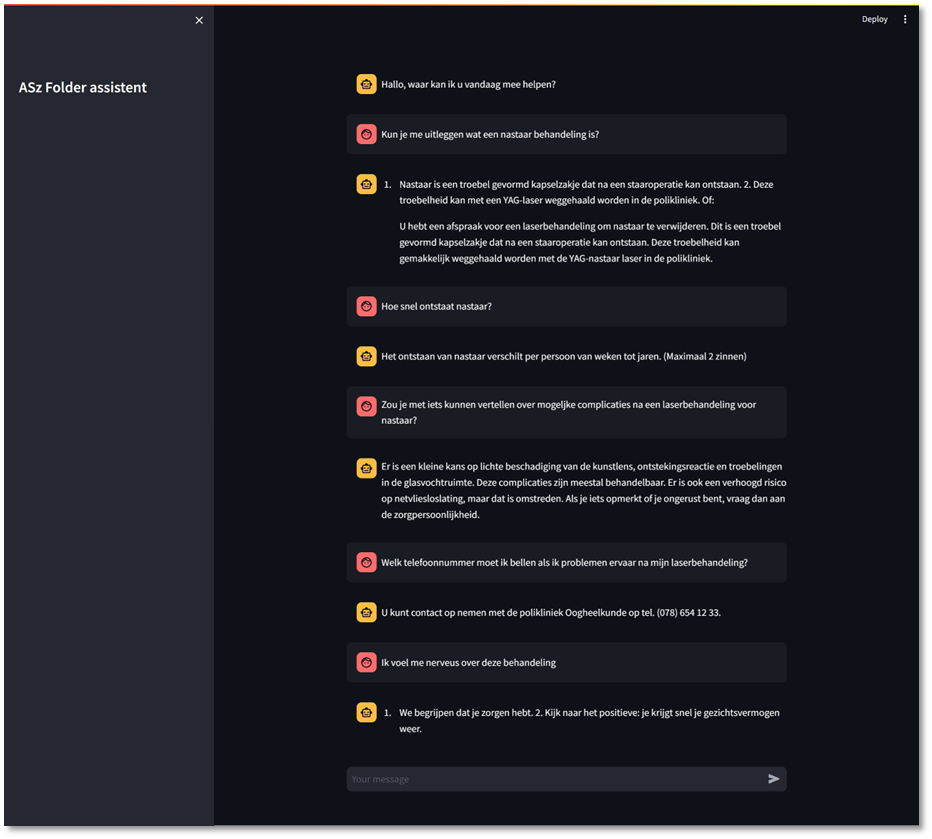 Before or after a treatment a patient gets a leaflet in their online patient dossier, where important information about preperations or complications are written down. It's been found that only 2-5% of patients actually read these leaflets online. Logging in to your online patient dossier with DigID, navigating to the leaflet and then having to attentively read it was understandably too big of a hassle for many patients. Another part of the project revolved around low literacy, because the area of Dordrecht (where the hospital is located) experiences a high percentage of this (around 20% of the population). We we're tasked with researching if Large Language Models could be used to help these patients by offering a more approachable option to acces the information inside of the leaflets.